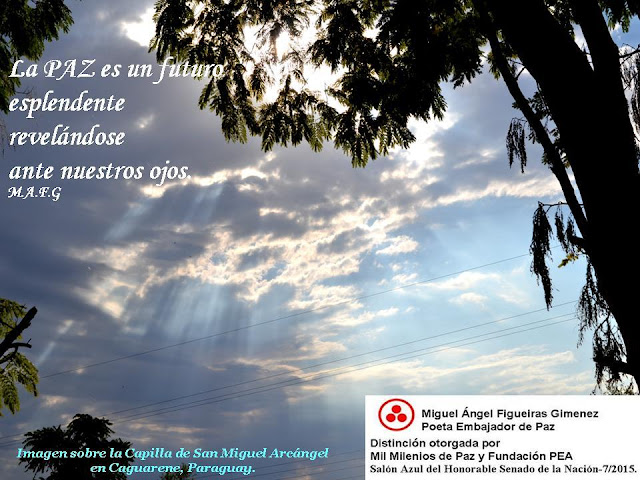 LA PAZ: “Para ser parte de este movimiento que todos en el mundo deseamos, no hay que ser de un raza determinada, tampoco importa si eres rico o pobre, ni la religión que profeses, tampoco importa tu inclinación sexual, ni de que partido político eres, tampoco hay que escribirse en ninguna lista ni pagar ningún arancel, -solo debemos ser humanos-, la PAZ esta allí en nuestro interior, hagamos que fluya libremente. Debemos saber también que la paz y sembrarla no significa andar por la vida como un solemne monje , la paz es fundamentalmente alegría y trabajo, es música, es energía, es deporte, es estudiar, es libertad y democracia, es familia y compartirlo todo evitando manifestaciones ofensivas hacia el prójimo” Miguel Angel Figueiras Gimenez. Poeta Embajador de Paz-Argentina-